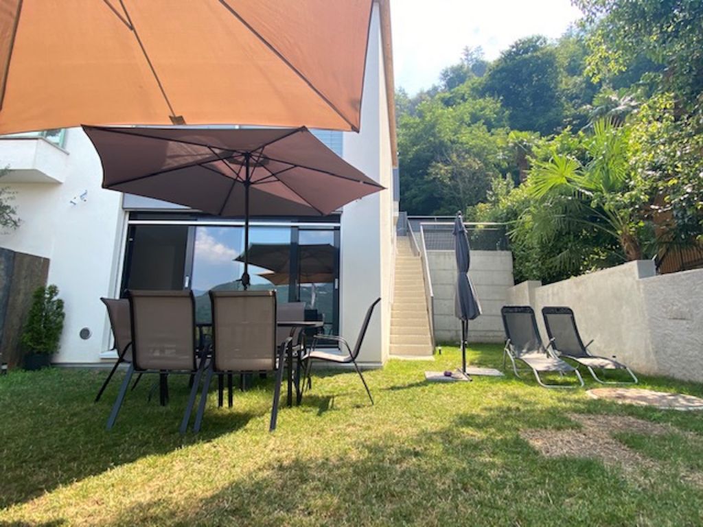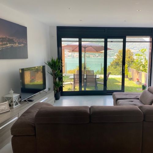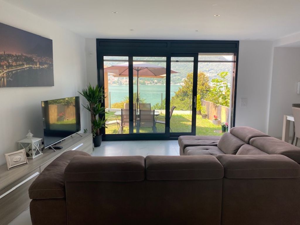 Dalla luminosa sala si accede direttamente sul piacevole giardino che diventa un secondo luogo dove poter godere di una splendida vista lago.